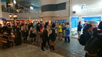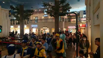 パレード隊のお仕事です。この仕事体験に参加していない子どもたちも、楽しそうに周りを取り巻いたり、後に続いたりしています。そろそろ終わりの時間です。