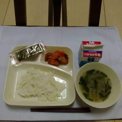 今日の給食は酢豚、中華スープ、焼きのり、ごはん、牛乳でした。