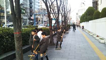 今日は4年2組の人たちが、地域の方々と一緒に「ふれあい清掃」をしました。少し早めに登校して正門付近の道路やピロティ—をきれいにします。掃除用具の使い方もだんだん上手になりました。身の回りを美しく整えておくことは、とても大切なことですね。