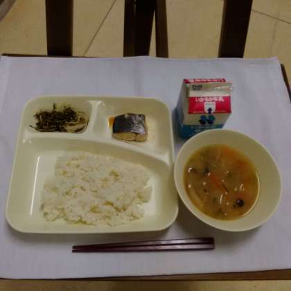 今日の給食は、さごしのしょうゆだれかけ、水菜のにびたし、みそ汁、ごはん、牛乳でした。