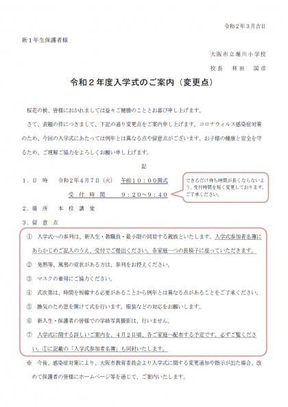 令和2年度入学式について、新1年生保護者の皆様にお知らせいたします。