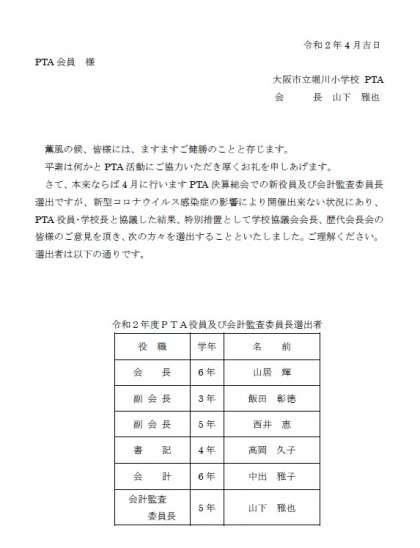 さて、本来4月におこないますPTA決算総会での新役員選出等が、新型コロナウイルス感染症の影響により、開催できない状況となっております。