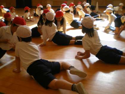 今年度、児童の体力向上の取り組みの一つとして、体つくり運動を行っています。ゲストティーチャーを招き、低学年の児童から順番にクラスごとに活動しています。本日は1年生と2年生が行い、全身を使って様々な運動に取り組みました。