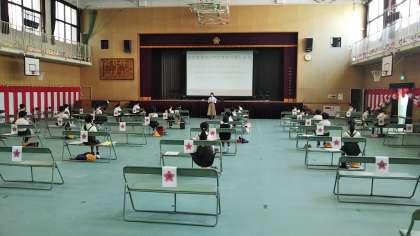 新しい担任の先生や友だちと出会いました。緊張気味でしたが、一生懸命お話を聞くことができました。検温がまだのお子さんには、ピロティで検温を行います。ご家庭での朝の検温にご協力いただきますようお願いいたします。