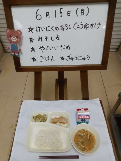今日の給食は、鶏肉のおろしじょうゆかけ、野菜いため、みそ汁、ごはん、牛乳。