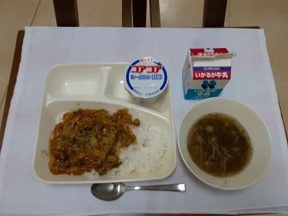 今日の給食は、和風カレー丼、もずくとオクラのとろり汁、ヨーグルト、牛乳でした。