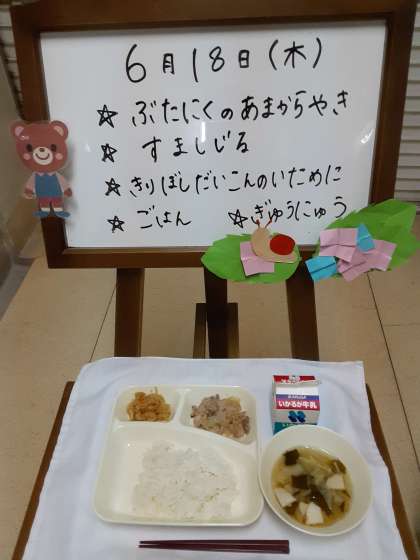 今日の給食は、豚肉の甘辛焼き、切り干し大根のいため煮、すまし汁、ごはん、牛乳でした。