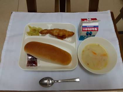 今日の給食は、サーモンフライ、キャベツのカレーソテー、豆乳スープ、コッペパン、いちごジャム、牛乳でした。