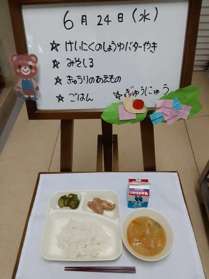今日の給食は、鶏肉のしょうゆバター焼き、きゅうりのあえもの、みそ汁、ごはん、牛乳でした。