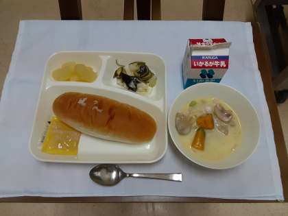 今日の給食は、かぼちゃのクリームシチュー、ミックス海藻のサラダ、りんご(かんづめ)、コッペパン、アプリコットジャム、牛乳でした。