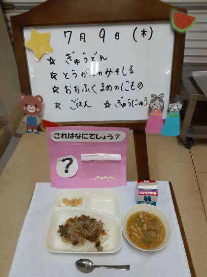 今日の給食は、牛丼、大福豆の煮物、とうがんのみそ汁、牛乳でした。