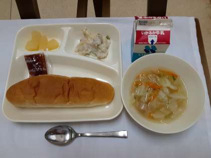 今日の給食は、マカロニグラタン、スープ、りんご(かんづめ)、コッペパン、いちごジャム、牛乳でした。
