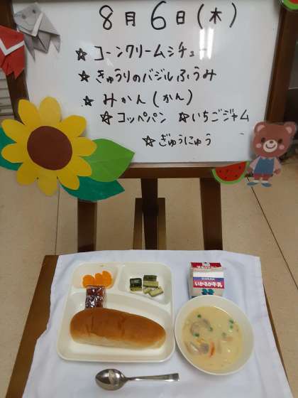 今日の給食は、コーンクリームシチュー、きゅうりのバジル風味サラダ、みかん(かんづめ)、コッペパン、いちごジャム、牛乳でした。