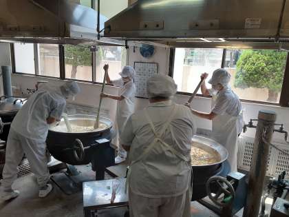 給食では、バターと小麦粉をいためた手作りのルウを使ってシチューを作っています。