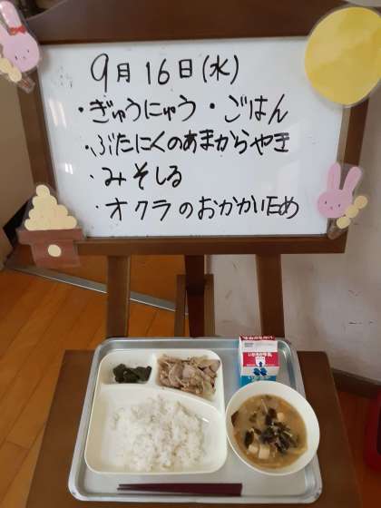 今日の給食は、豚肉の甘辛焼き、オクラのおかかいため、みそ汁、ごはん、牛乳でした。