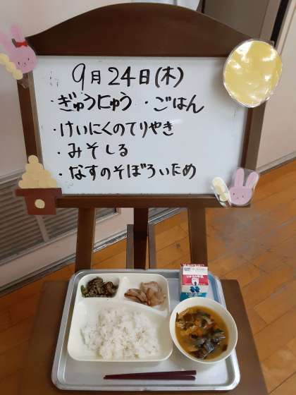 今日の給食は、鶏肉の照り焼き、なすのそぼろいため、かぼちゃのみそ汁、ごはん、牛乳でした。