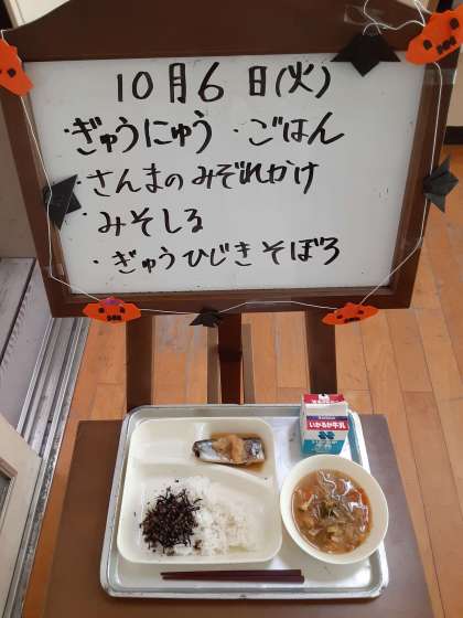 今日の給食は、さんまのみぞれかけ、牛ひじきそぼろ、みそ汁、ごはん、牛乳でした。