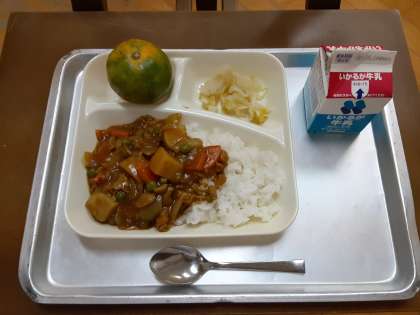 今日の給食は、ポークカレーライス(米粉)、はくさいのピクルス、みかん、牛乳でした。