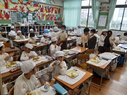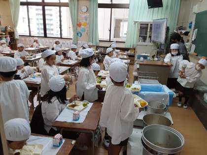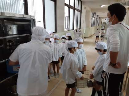 教室の前に、給食をのせたコンテナを調理員さんが持ってきてくれます。