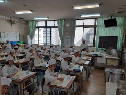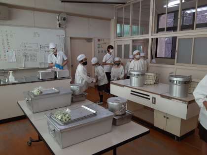 4年生は、家庭科室に給食をとりにきています。