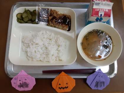 今日の給食は、お好み焼き、豚汁、きゅうりの梅風味、ごはん、牛乳でした。