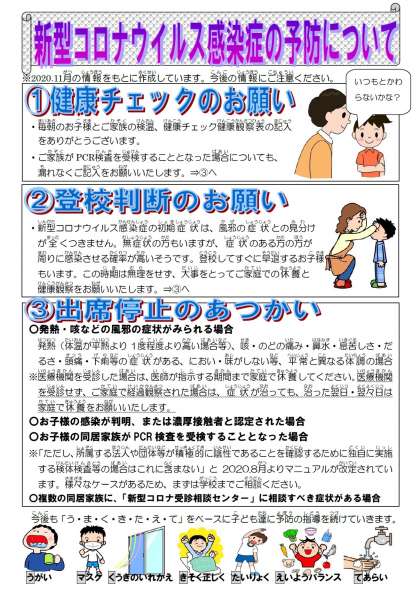 なお、お子様に発熱等かぜ症状がある場合や、同居家族が新型コロナウイルスの検査(PCR検査もしくは抗原検査)を受けることとなった場合には、必ず学校へ連絡をいただき、登校を控えて休養させるようお願いいたします。