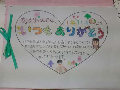 給食委員会の代表から、調理員さんへ、感謝状をわたしました。