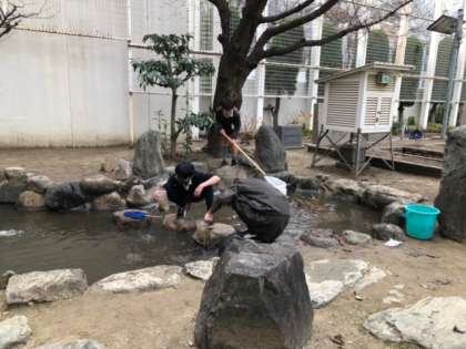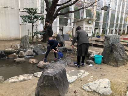 もうすぐ、この場所で新しい校舎の建設が始まるため、メダカを理科室へ移しているのです。