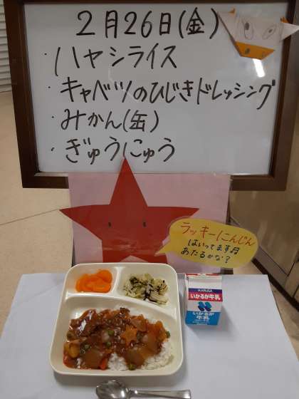 「ハヤシライス、キャベツのひじきドレッシング、みかん(缶)、牛乳」でした。