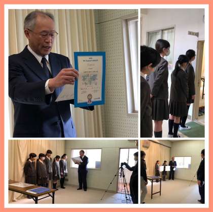 読書感想画やコンクールや国際平和ポスターコンクールでそれぞれ賞をいただき一人一人校長先生から、賞状を受け取りました。
