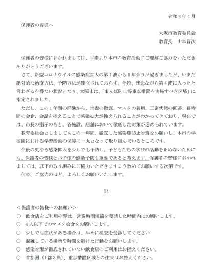 教育委員会より「新型コロナウイルス感染症の予防について」および「教育長メッセージ」の文書が届いています。