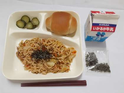 「焼きそば、きゅうりのしょうがづけ、黒糖パン」でした。