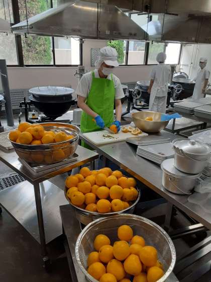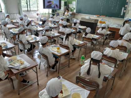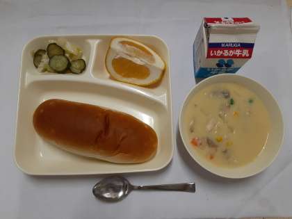 「コーンクリームシチュー、キャベツときゅうりのサラダ、かわちばんかん、おさつパン、牛乳」でした。