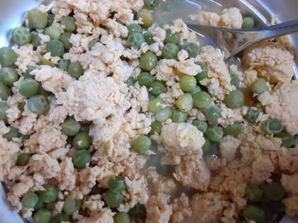 今日は、給食室でさやからとり出した生のえんどうを使っています。