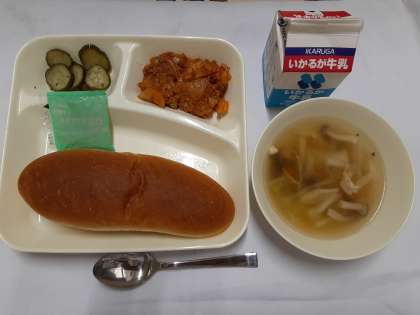 「じゃがいものミートグラタン、スープ、きゅうりのバジル風味サラダ、