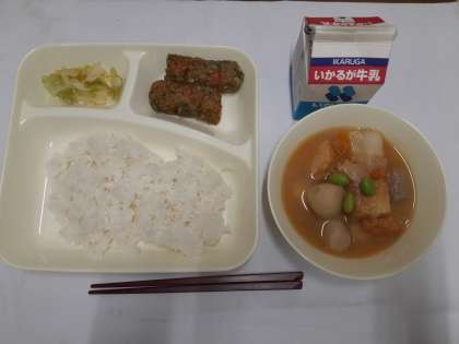「ちくわのいそべあげ、あつあげとさといもの煮物、あっさりきゅうり、ごはん、牛乳」でした。