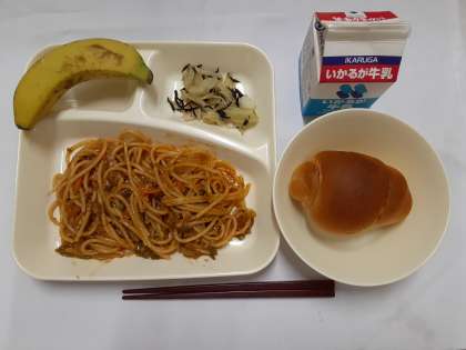 「カレースパゲッティ、キャベツのひじきドレッシング、バナナ、黒糖パン、牛乳」でした。