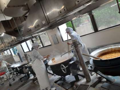 カレースパゲッティは、大きな釜を3つ使って作っています。