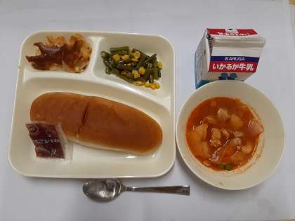 「ケチャップ煮、三度豆とコーンのソテー、りんごのクラフティ、コッペパン、いちごジャム」でした。
