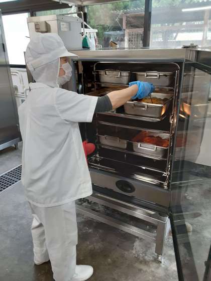 写真は、調理員さんが、クラフティの温度がしっかり上がっているか、