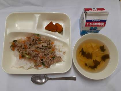「豚丼、かぼちゃのそゆゆ焼き、湯葉のすまし汁」でした。