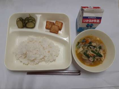 今日の給食は中華煮、あつあげのピリ辛じょうゆかけ、きゅうりの中華あえでした。