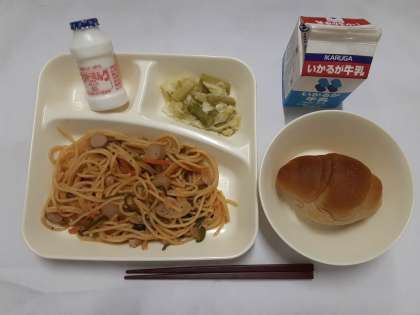 「チキントマトスパゲッティ、グリーンアスパラガスとキャベツのサラダ、発酵乳、黒糖パン、牛乳」でした。