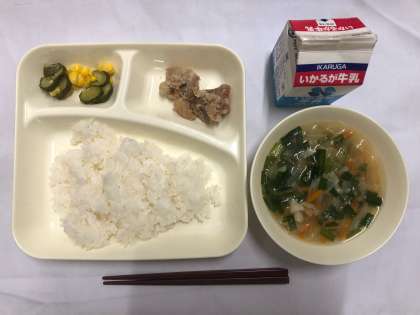 「鶏肉のからあげ、中華みそスープ、きゅうりとコーンの甘酢和え、ごはん、牛乳」でした。