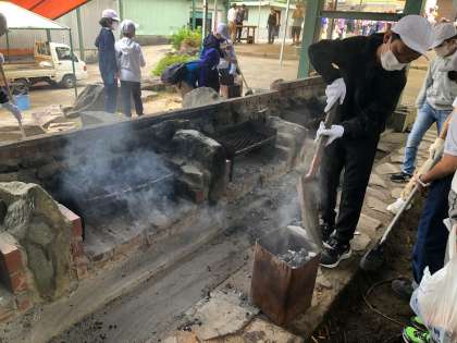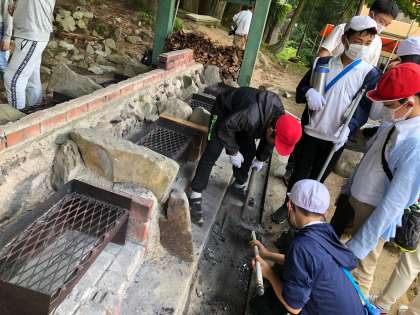 たっぷり食べたあとは、使ったテーブルをきれいにして、かまどの残り炭の始末もします。