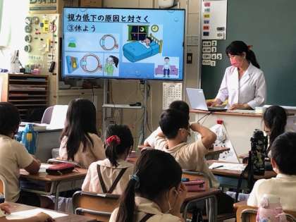 その原因や目の仕組み、目を大切にする生活について、養護教諭田村先生から教えてもらいました。