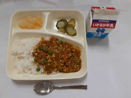 今日の給食は「大豆入りキーマカレーライス[米粉]、きゅうりのピクルス、白桃(カット缶)、牛乳」でした。
