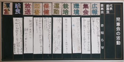 本校には、9つの児童委員会があります。各委員会では年度初めに1年間のめあてを話し合って決めています。