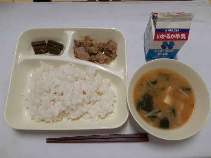 今日の給食は「豚肉の甘辛焼き、みそ汁、オクラのおかかいため、ごはん、牛乳」でした。