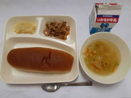 今日の給食は「豚肉と野菜のケチャップソテー、スープ、スイートポテト、黒糖パン、牛乳」でした。